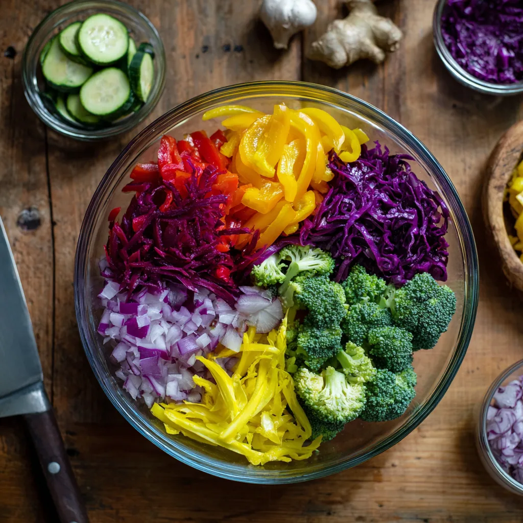 Râpez la carotte, émincez le chou rouge, coupez le concombre en rondelles, et divisez les tomates cerises en deux. Coupez l’avocat en dés au dernier moment et arrosez-le de jus de citron pour éviter l’oxydation.