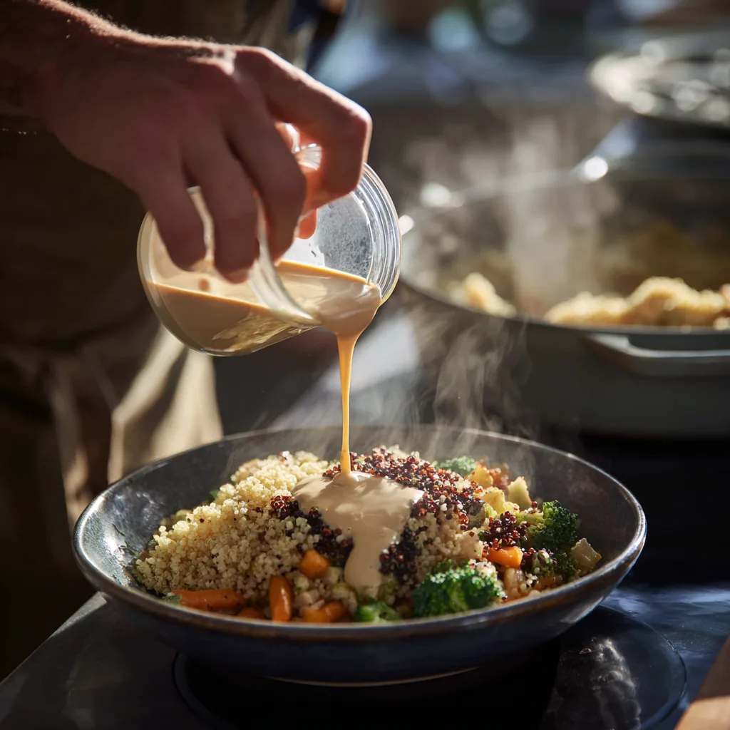 Ajouter la sauce trop tôt — La sauce ramollit les légumes croquants. Versez-la toujours au dernier moment, juste avant de servir ou d’emporter votre bowl.