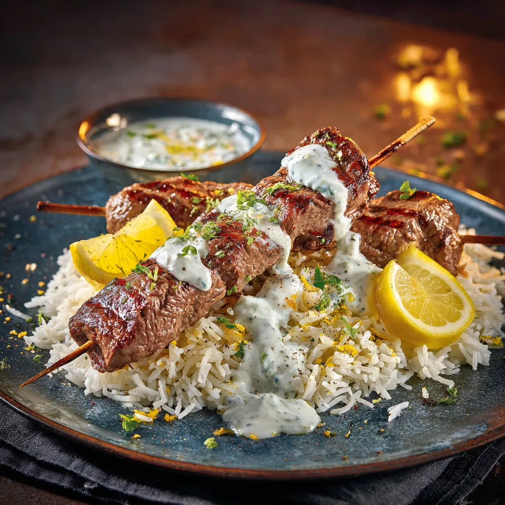 Brochettes de bœuf grillées — un incontournable des repas en plein air, avec une viande tendre, juteuse et délicatement parfumée aux herbes. Un vrai plaisir convivial.