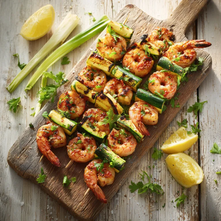 Les brochettes de gambas aux courgettes sont l’un de ces plats délicieux qu’on prépare vite, qu’on déguste lentement et dont on se souvient longtemps. Elles me ramènent instantanément à l’été de mes dix ans, quand ma grand-mère allumait le barbecue dans le jardin le dimanche après-midi : elle enfilait les gambas sur les piques en bois avec précision, pendant que l’odeur des courgettes grillées se mêlait à celle de la mer. Un souvenir gravé à jamais.