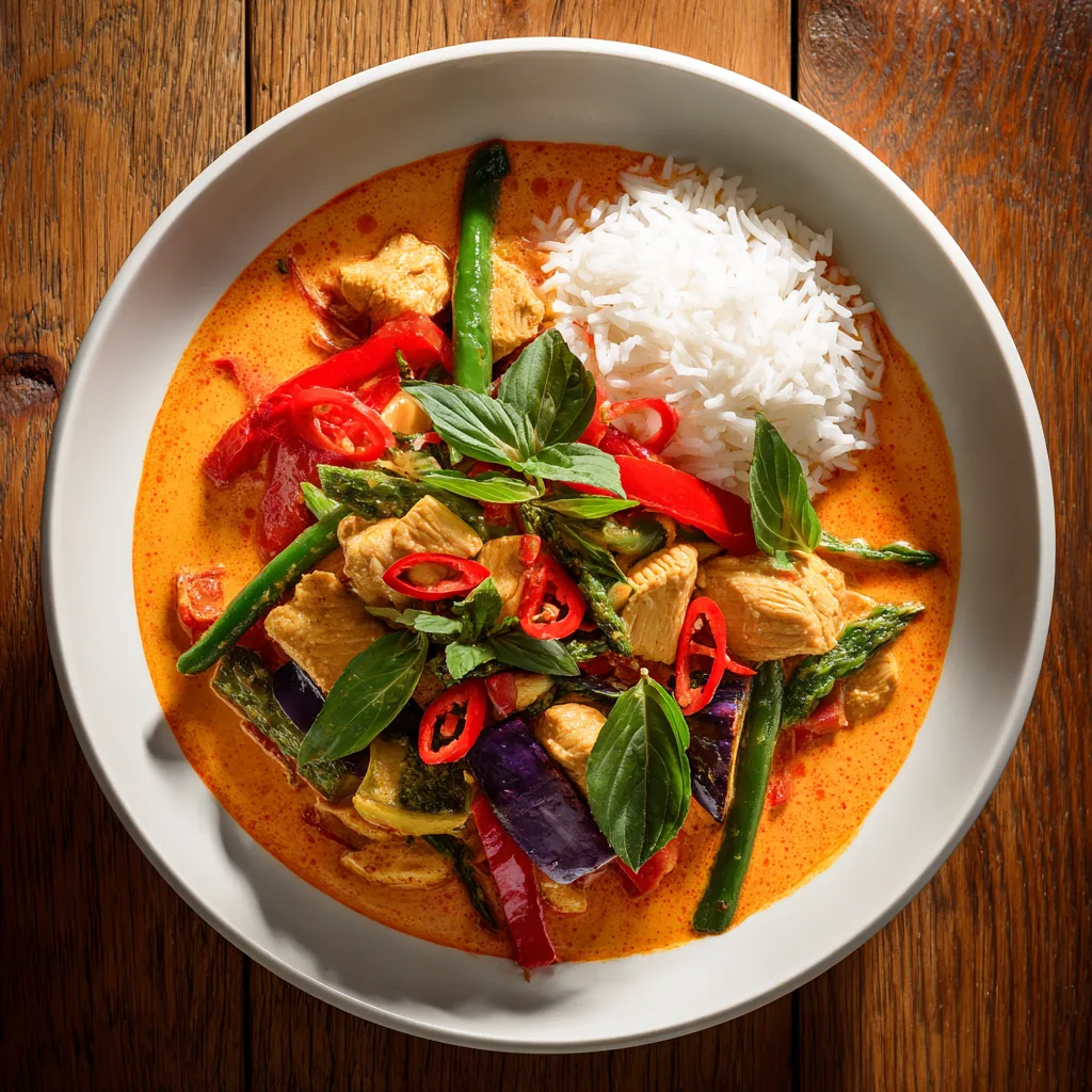 1. CUISSON DU RIZ Faire cuire le riz basmati ou thaï selon les instructions du paquet dans une casserole séparée. 2. PRÉPARATION DES INGRÉDIENTS Couper le poulet en morceaux de 3 cm. Émincer tous les légumes, hacher l’ail et l’oignon, râper le gingembre et hacher la citronnelle. 3. TORRÉFACTION DE LA PÂTE Dans un wok ou grande casserole, faire chauffer l’huile à feu moyen. Ajouter la pâte de curry rouge et faire revenir 1-2 minutes en remuant constamment jusqu’à ce qu’elle soit odorante. 4. AJOUT DES AROMATES Incorporer l’oignon émincé, l’ail, le gingembre et la citronnelle. Faire revenir 3-4 minutes jusqu’à ce que l’oignon soit translucide. 5. CRÉATION DE LA SAUCE Mouiller avec un petit verre d’eau pour détendre la pâte, puis incorporer progressivement le lait de coco en remuant bien pour obtenir une belle couleur rouge homogène. 6. ASSAISONNEMENT Ajouter le bouillon, la sauce de poisson, la sauce soja claire et le sucre de palme. Porter à frémissement et goûter pour ajuster. 7. CUISSON DU POULET Incorporer les morceaux de poulet dans la sauce et laisser mijoter 5 minutes en remuant régulièrement. 8. AJOUT DES LÉGUMES Ajouter d’abord les légumes fermes (carottes, aubergines, pousses de bambou), puis les plus tendres (poivrons, haricots verts). Ils doivent rester légèrement croquants. 9. MIJOTAGE Laisser mijoter 10-15 minutes à feu doux en remuant de temps en temps jusqu’à ce que les légumes soient tendres et le poulet complètement cuit. 10. FINITIONS Ajouter les feuilles de lime kaffir, le basilic thaï et les piments frais émincés dans les dernières minutes de cuisson. 11. SERVICE Servir chaud dans des bols avec le riz parfumé. Garnir de basilic frais et de rondelles de citron vert.