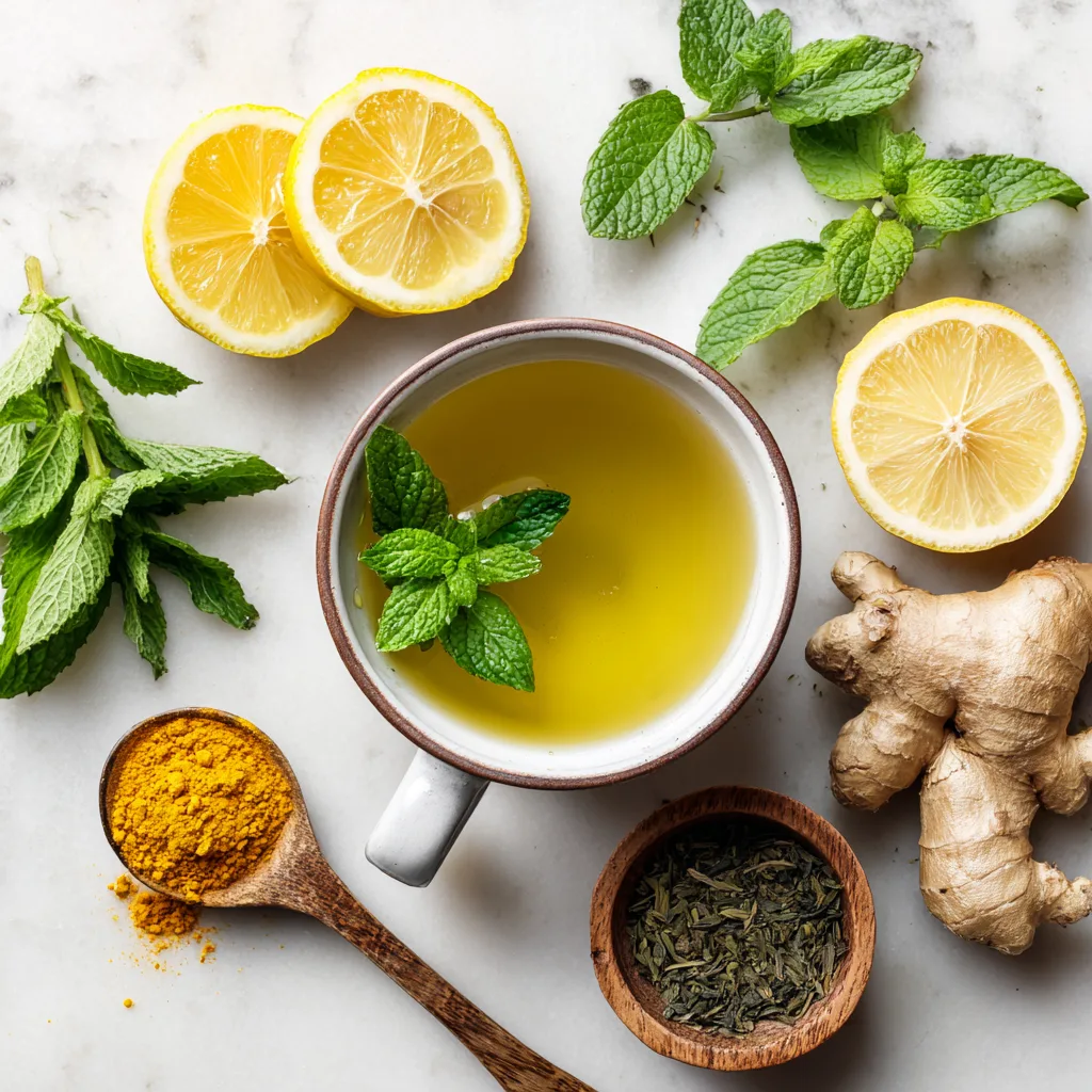 Citron, gingembre et menthe sont idéaux. Le curcuma est un bon complément. Évite le sucre, préfère un peu de miel bio.
